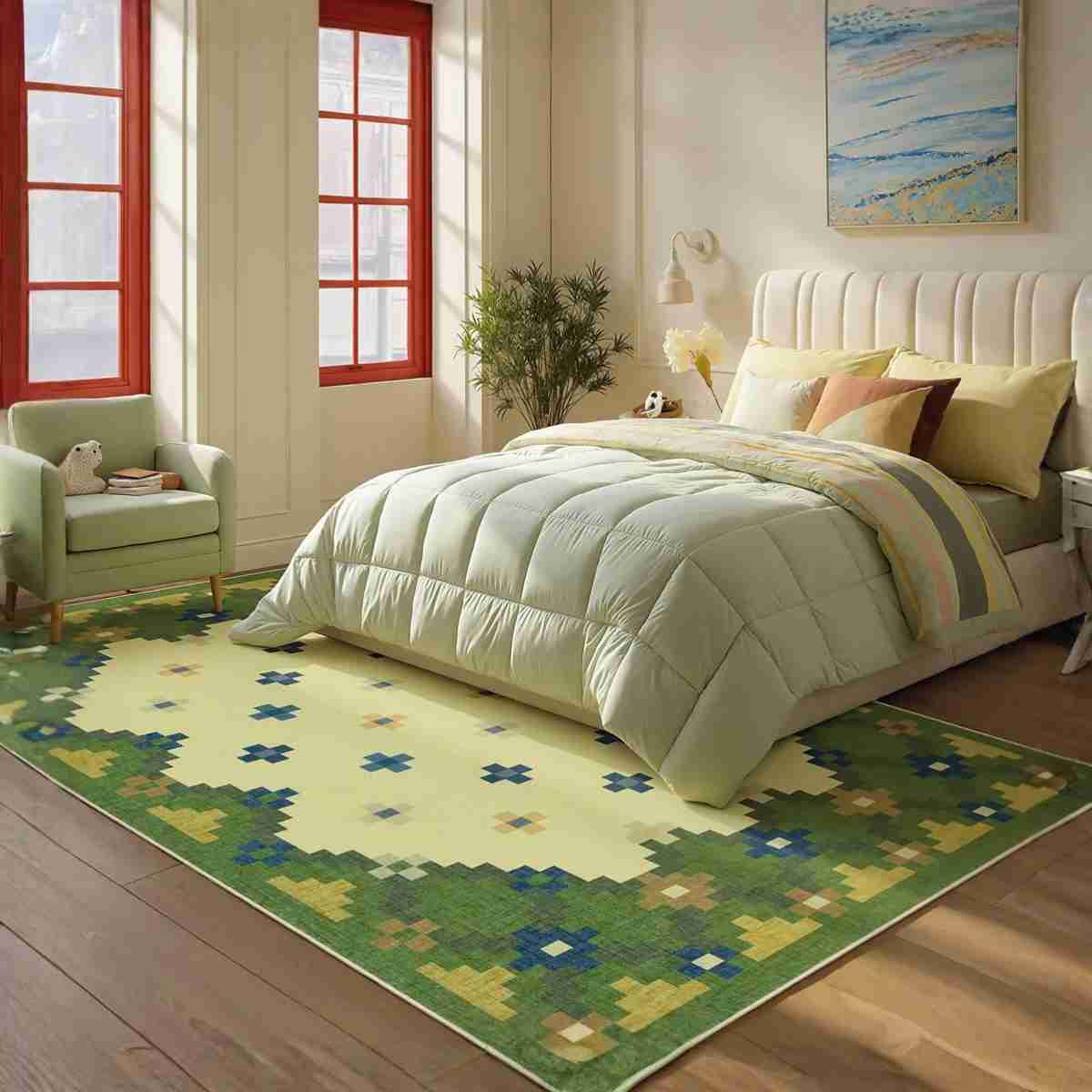 Transform your bedroom into a designer retreat with the Joydeco Geometric Modern Area Rug. Featuring a sophisticated pixelated floral and geometric motif in shades of forest green, sage, and cream, this rug adds a vibrant pop of color without overwhelming your space. The low-pile construction makes it incredibly easy to clean and maintain, while the soft texture provides a cozy landing for your feet every morning. Perfect for bedrooms, home offices, or eclectic living areas.